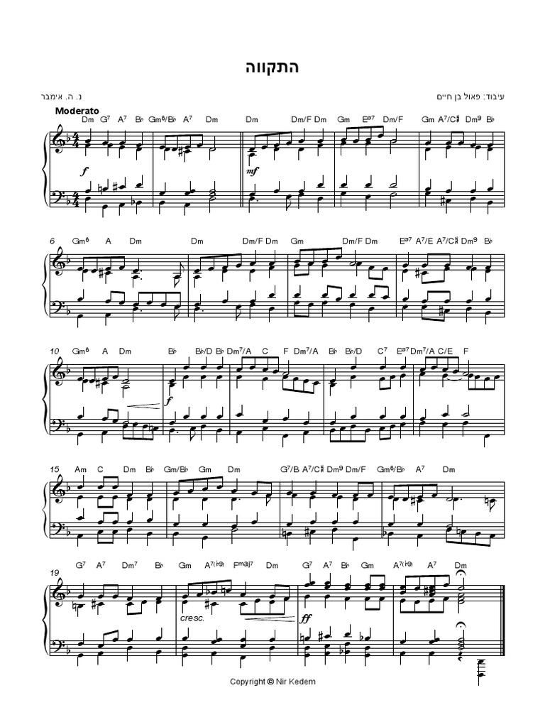 לימודי פסנתר | מגשימים חלום: כולם על הרגליים לשירת התקווה. באתרנו אפשר למצוא תווים משיריהם של זמרים, זמרות ולהקות כמו: לפניכם מאות תווים לשירים עבריים. השיר הושר בסיום הקונגרסים הציוניים החל משנת 1907, ונקבע כהמנון התנועה הציונית בשנת 1933.
